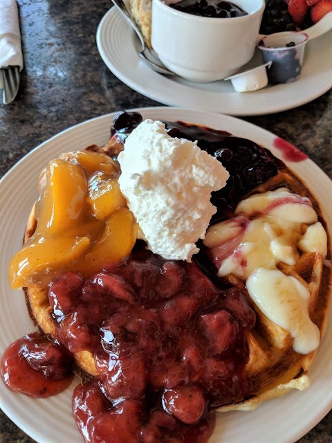 私もちゃっかり食べさせてもらいましたが、ワッフル生地がとても美味しい。今までで食べたワッフルの中で一番おいしいワッフルでした。そこにさらに新鮮なベリーソースをかけるんですから、本当に最高です。朝食なら絶対ワッフルがオススメ!!!そしてもしワッフルを甘々にするなら、ソーセージかベーコンか、塩気のあるものを追加するといいと思います。